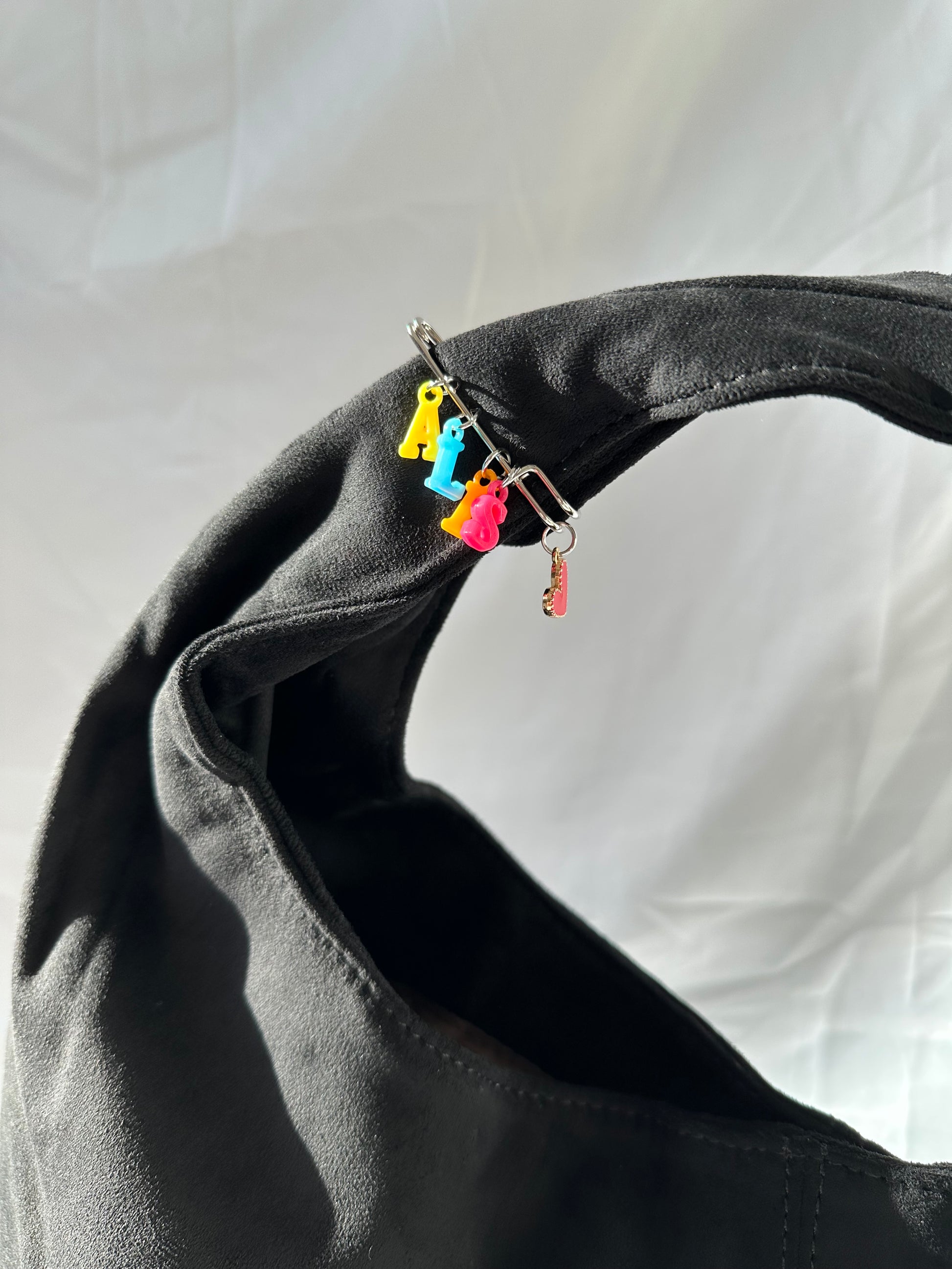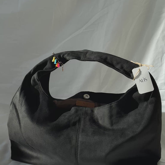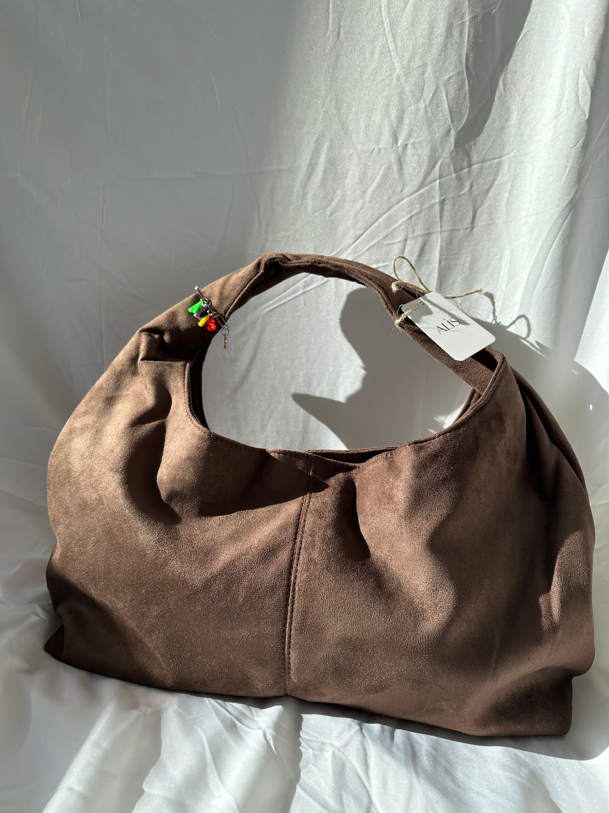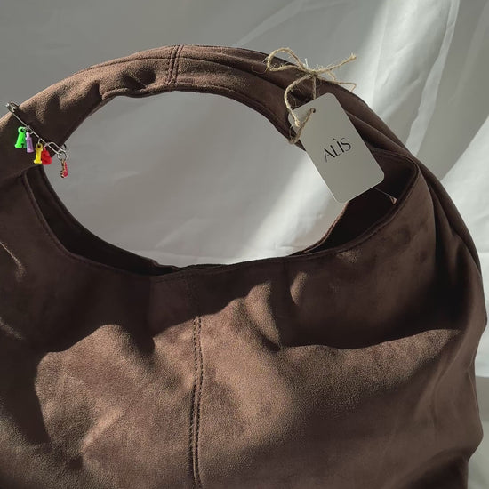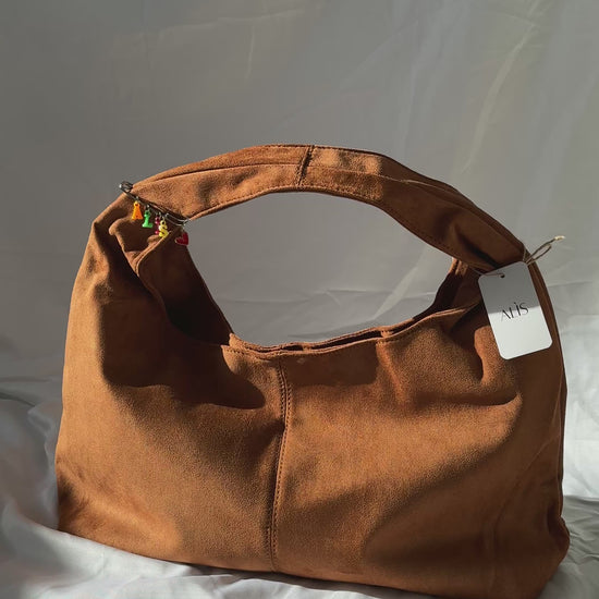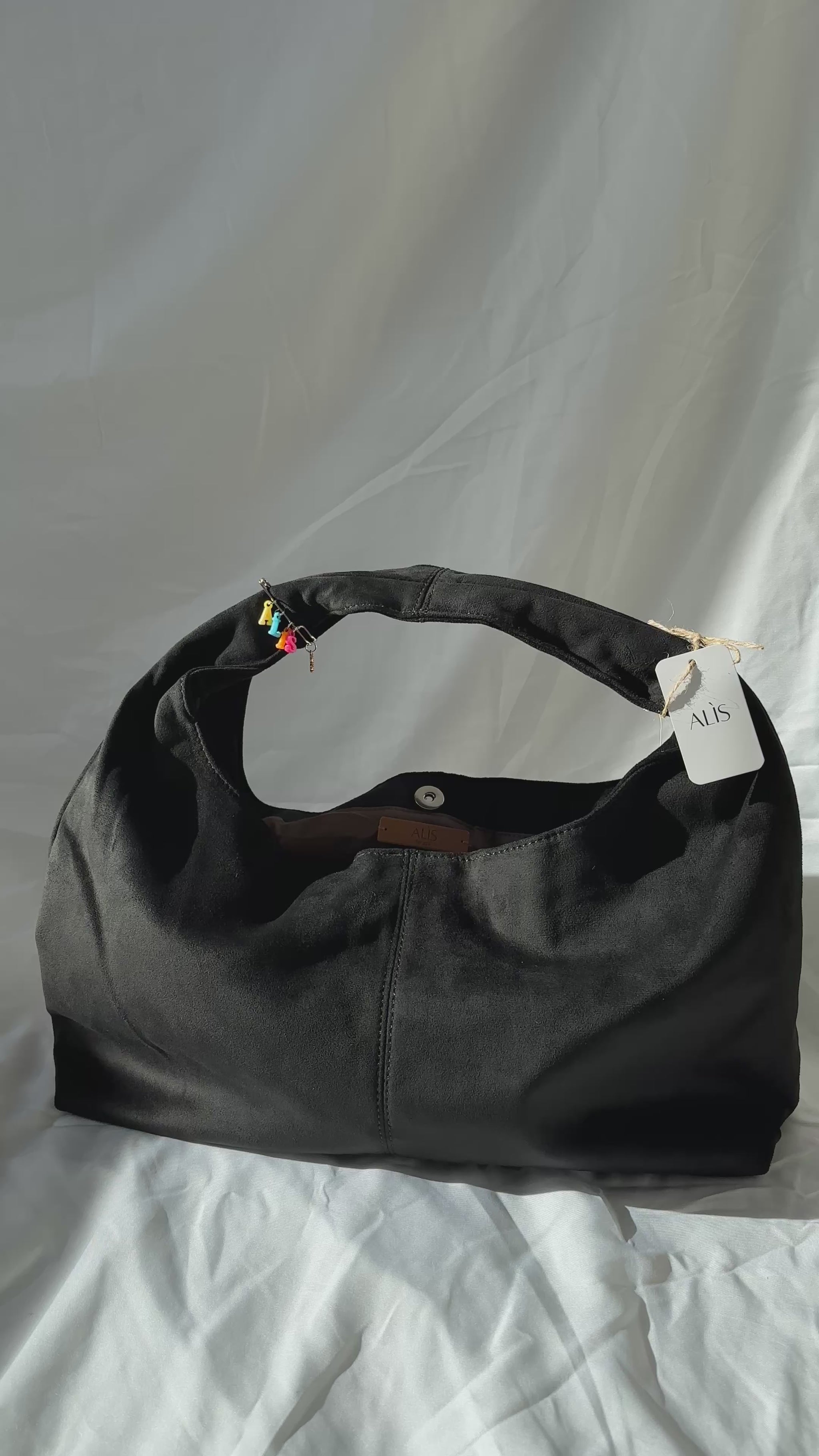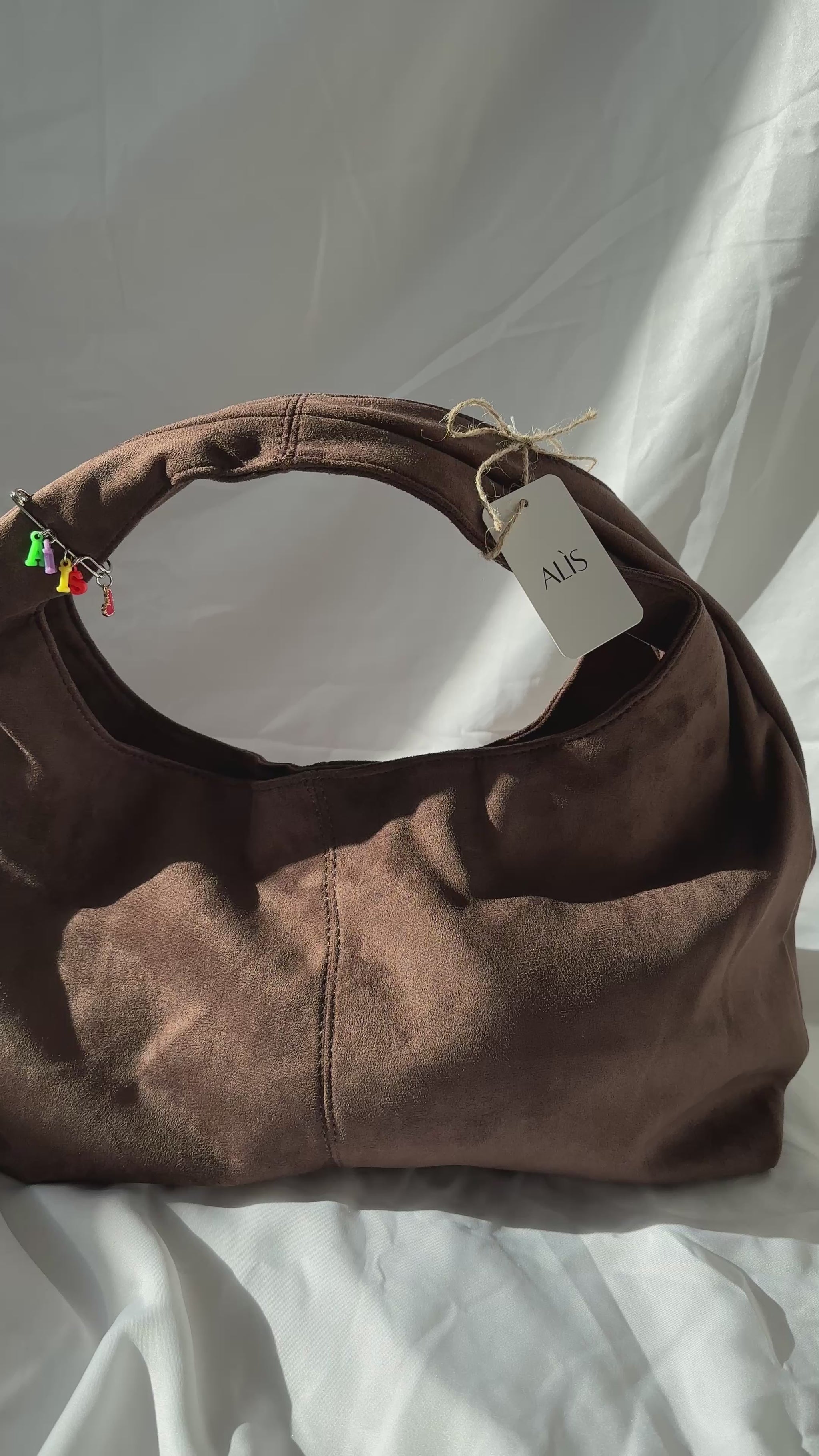 This soft suede-effect bag combines comfort, practicality, and elegance in a clean, modern design. Its flexible shape makes it perfect for everyday use, offering plenty of space and lightness without compromising on style. The wide handle ensures comfortable carrying, while the small colorful charms Alìs add a unique and distinctive touch.